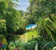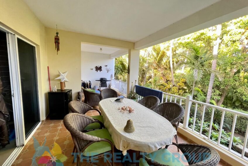 The apartment features air conditioning in both bedrooms, a huge open-plan living and dining area, and a large kitchen with a central island and wooden cabinets. Step outside to your private terrace overlooking lush tropical gardens and a pristine pool—perfect for morning coffee or evening drinks.
